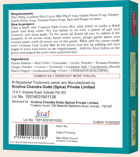 Receipe: Take a bowl, mix ‘Cookme Fish Curry Mix’ with water to make a thick paste and keep aside. Fry the fishes in oil with a pinch of salt and turmeric and keep aside. To the same oil (fresh oil can be added if the quantity of oil seems less), sauté onion paste, ginger-garlic paste and tomato paste until oil seeps out of the paste. Then add the paste made with ‘Cookme Fish Curry Mix’ in the gravy and stir by adding salt and sugar to taste and water as per requirement. Add the fried fishes in the gravy and seam it for some time and serve hot.